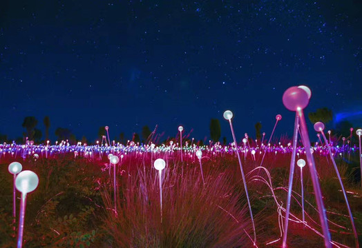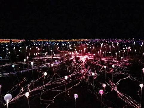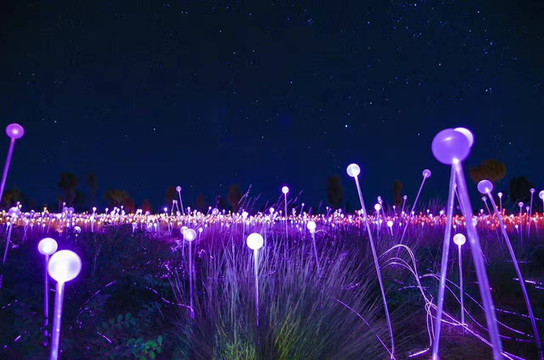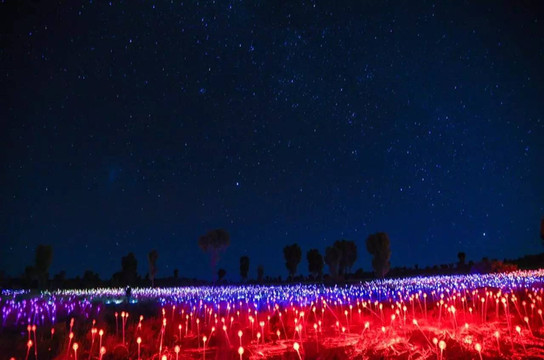 这由艺术家Bruce Munro 2016年在澳洲乌鲁鲁创造,由五万多个覆盖着磨砂玻璃球体的发光管子组成,占地面积相当于四个英超足球场的大小,也是首个完全依靠太阳能发光的艺术装置展。