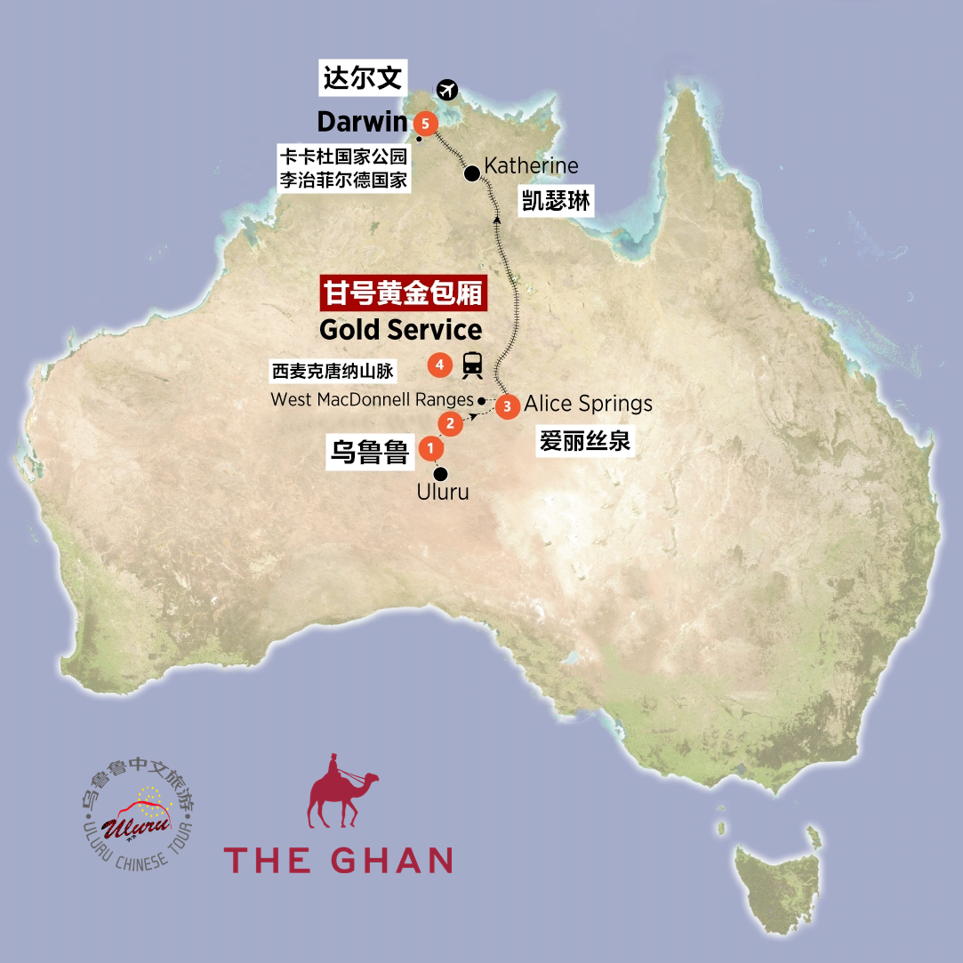 下午5点前导游将您送往爱丽丝泉火车站(Alice Springs Train Station @ George Crescent, Alice Springs NT)您可托运两件行李,每件不超过20公斤。洗漱用品,换洗衣物,备用药,贵重物品等请放在随身携带的手提行李带上车厢,其他大件行李按照火车公司要求需要托运。登上甘号列车,开启精彩的列车之旅。晚餐于列车上的阿德莱德皇后号餐厅享用西餐。